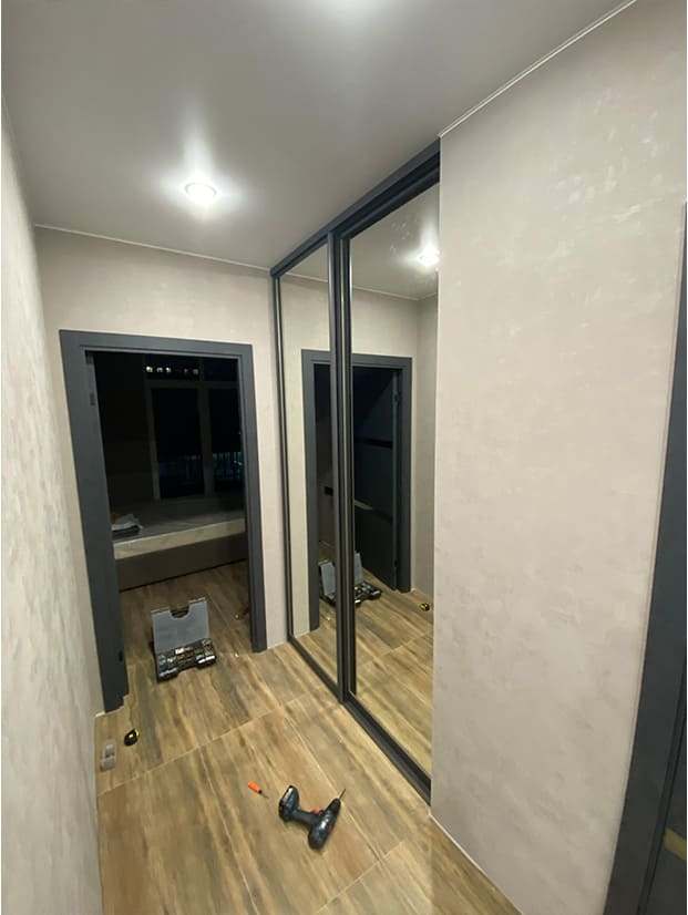 Если двери планируются до потолка, а потолок натяжной — необходимо заранее предусмотреть закладную под верхний направляющий трек.